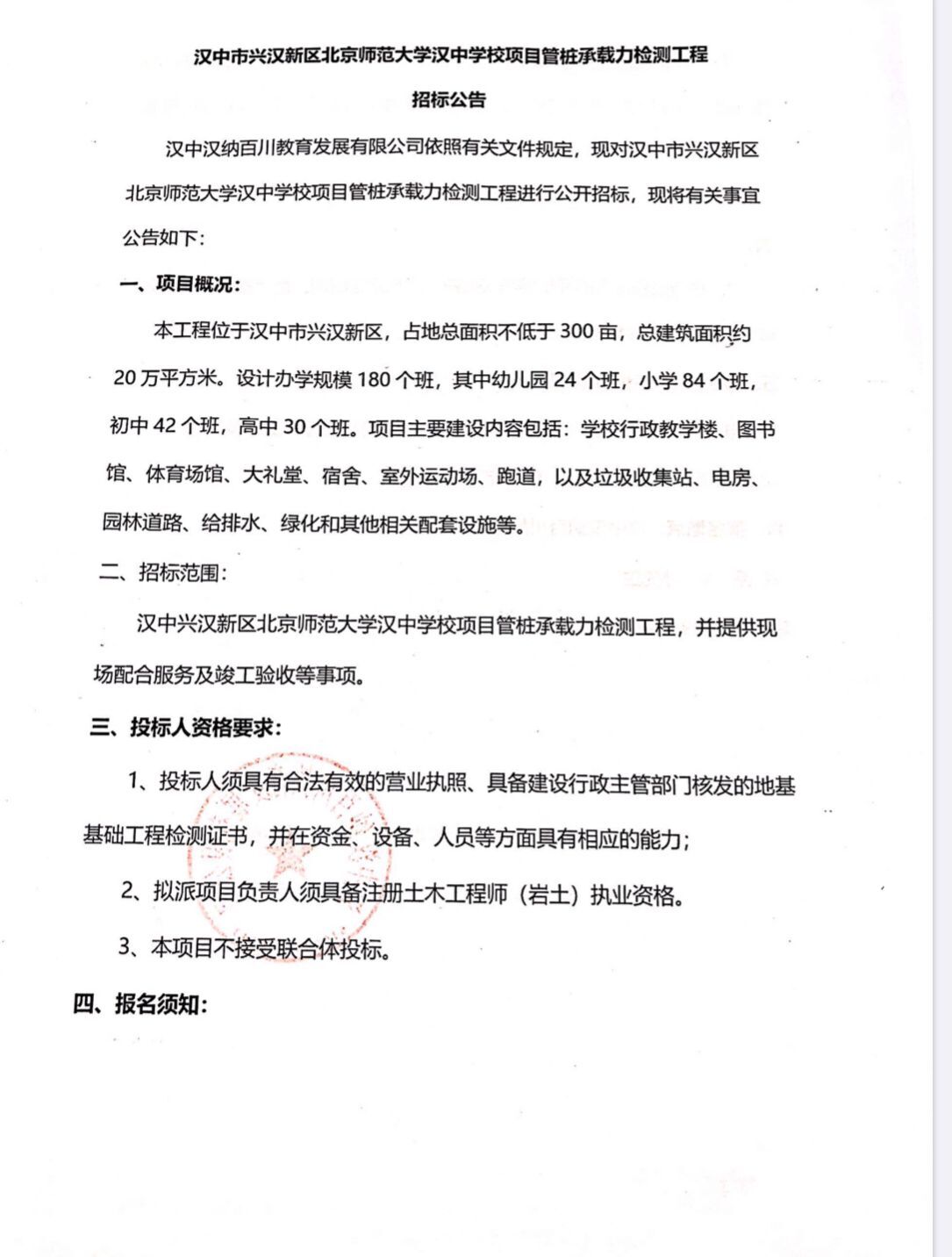 漢中市興漢新區(qū)北京師范大學(xué)漢中學(xué)校項(xiàng)目管樁承載力檢測(cè)工程招標(biāo)公告  漢中漢納百川教育發(fā)展有限公司...